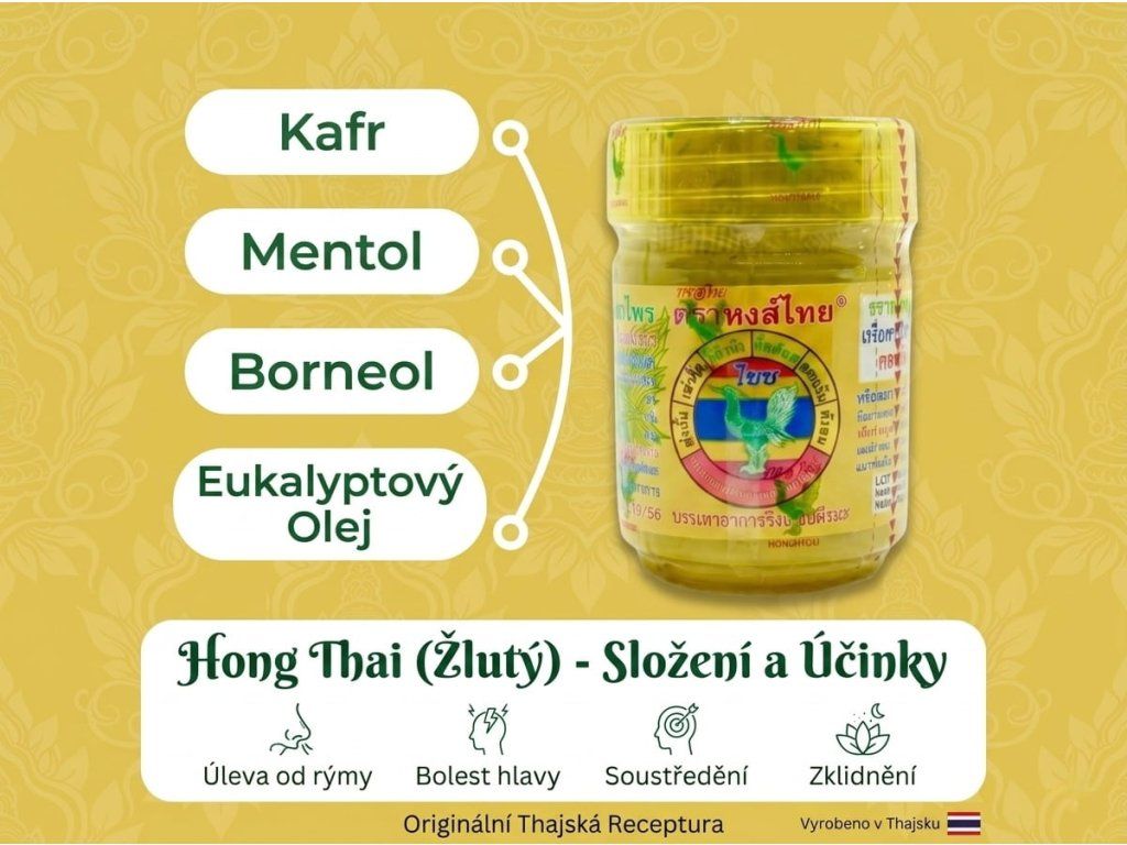 Odskrutkujte viečko a zhlboka sa nadýchnite striedavo každou nosnou dierkou pre maximálny účinok. Hong Thai žltý sa zmestí do vrecka, tašky, do auta aj na pracovný stôl. Kedykoľvek potrebujete „reštart", stačí siahnuť po fľaštičke.